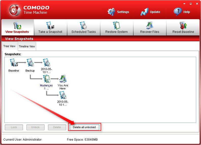 Nosso primeiro trabalho é conhecer mais sobre as fotos do sistema que o programa tira (snapshots). Não é possível voltar a um instante qualquer, a viagem no tempo só ocorre através dos momentos registrados pelas fotos. Por padrão, o Comodo Time Machine cria sua primeira foto no ato da instalação e sempre que detectar mudanças substanciais no sistema operacional.A tela inicial do programa exibe a árvore com todas as fotos. Com o passar do tempo, sua compreensão pode se tornar complicada, mas você conta alternativamente com a visualização na forma de linha do tempo.