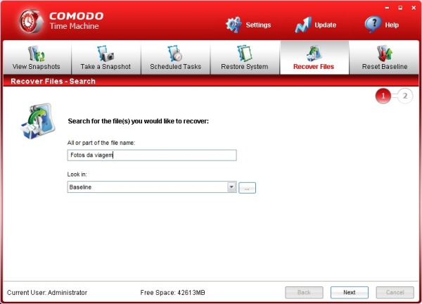 Não é preciso voltar no tempo só para buscar um único arquivo que deixamos para trás. Embora menos intuitiva, o programa oferece também uma ferramenta para a recuperação de documentos específicos dentro de fotos antigas do sistema na aba "Recover Files" (Recuperar arquivos).No primeiro passo, digite o nome do arquivo que deseja buscar (ou parte dele) e escolha dentro de qual snapshot ele se encontra. É claro que o tempo de busca é muito maior que uma simples varredura em seu disco local.