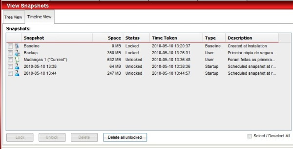 Abusar do número de fotos não é uma boa ideia. Além de o registro consumir um processamento considerável da máquina, um número excessivo de fotos exige bastante espaço no disco rígido.De volta em “View Snapshots” (Ver snapshots), você pode deletar as fotos de que não precise mais. Apague-as manualmente ou limpe todas que não estão trancadas clicando em “Delete all unlocked” (Deletar todas que não estão travadas).